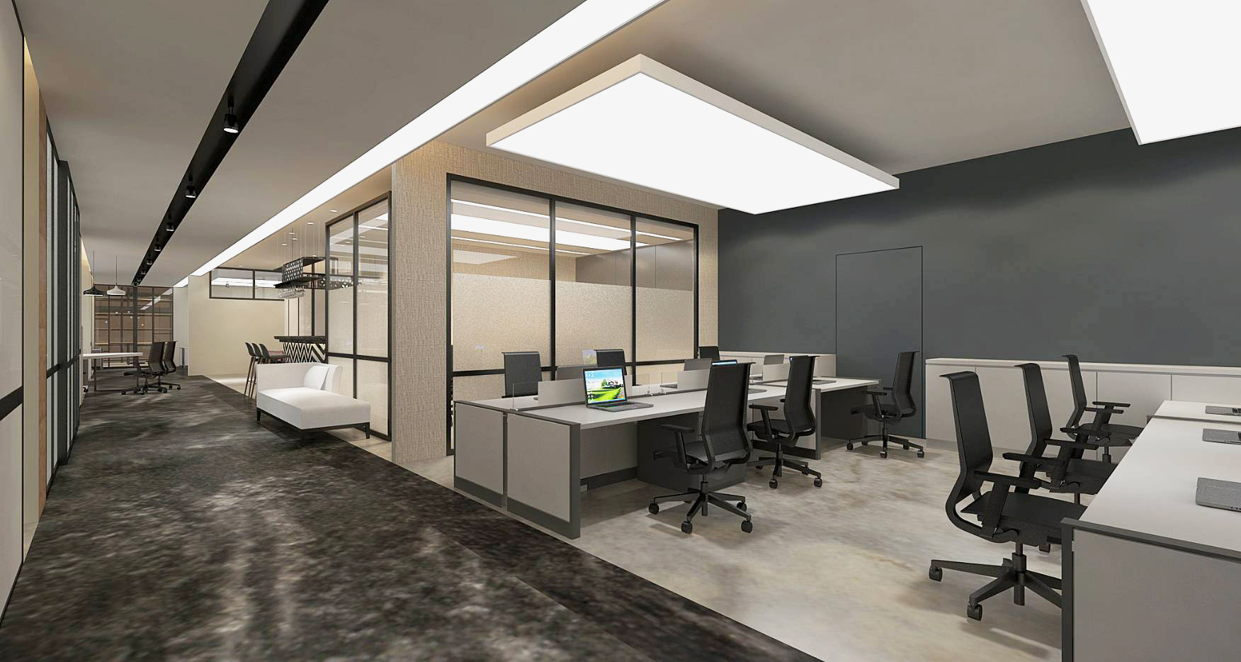 採用新技術 一 燈膜,塑造無接縫感的整面式天花板效果;狹長型的燈膜布料製作,另因尺寸過長,還需兩兩銜接一起,