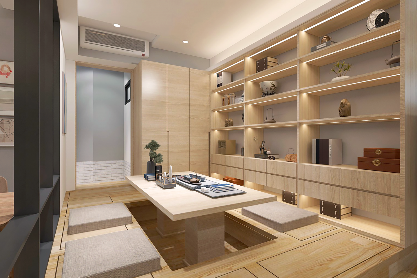 內斂、整齊劃一的分割拉門,為「收納」做到最整體性的分類,而在背後的灰鏡隱隱反射生活中,