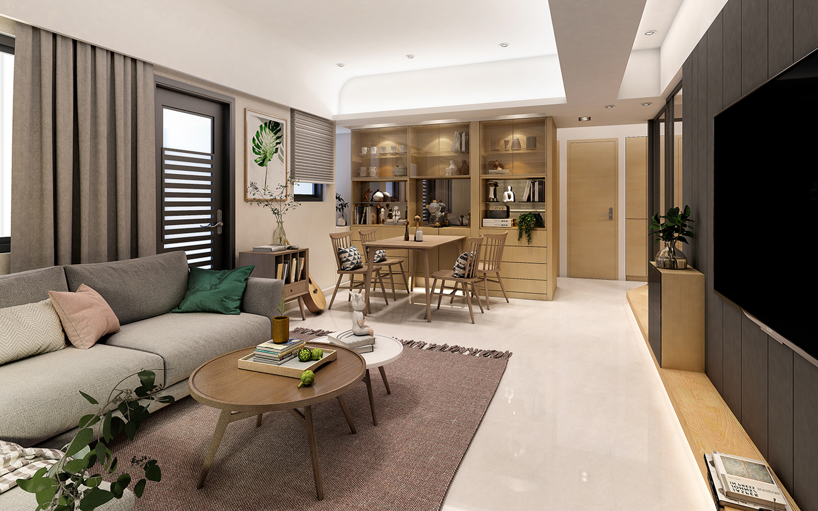 融合現代簡約與日式風格,以柔和的淺灰與溫暖的原木色調貫穿整個空間,