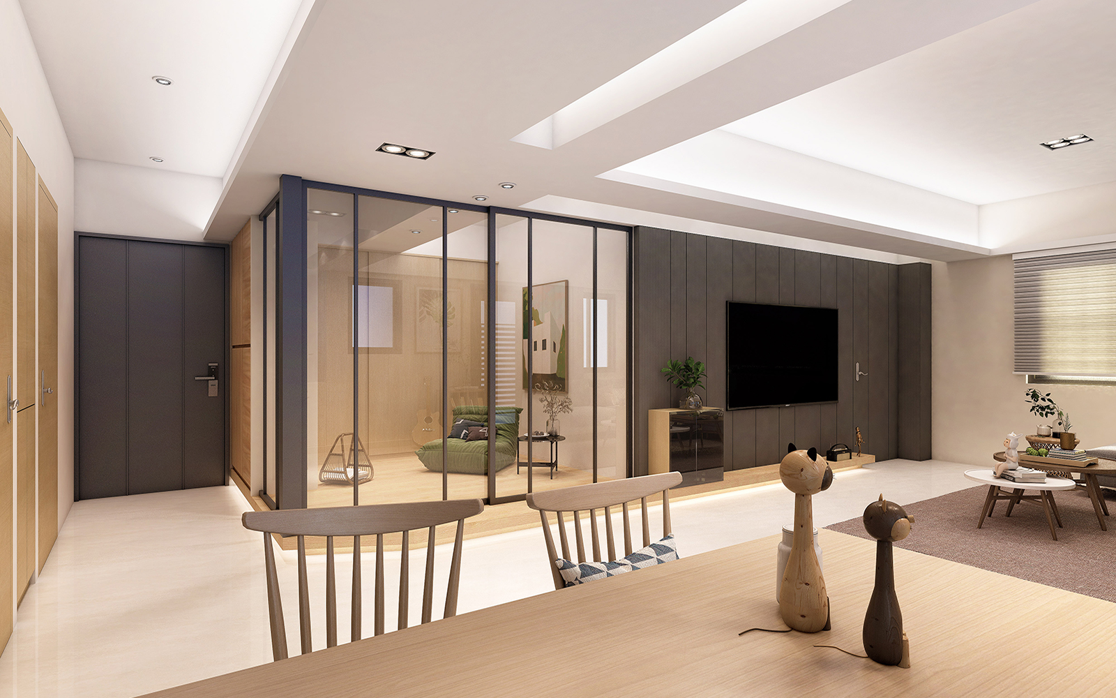 居住者對生活的優雅氣質。深灰色是帶領空間的主調,透過色彩,電視牆與和室