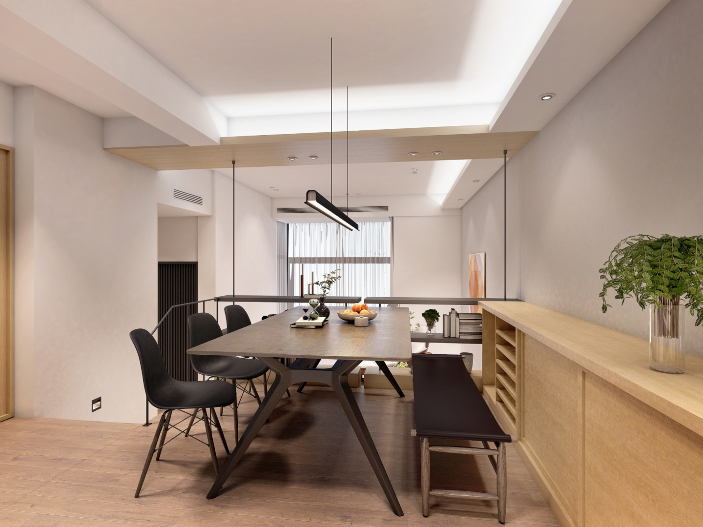 餐廳區的長桌與長凳,是居家辦公的重心,而俐落的桌上燈飾更是緊抓視線的焦點之一。