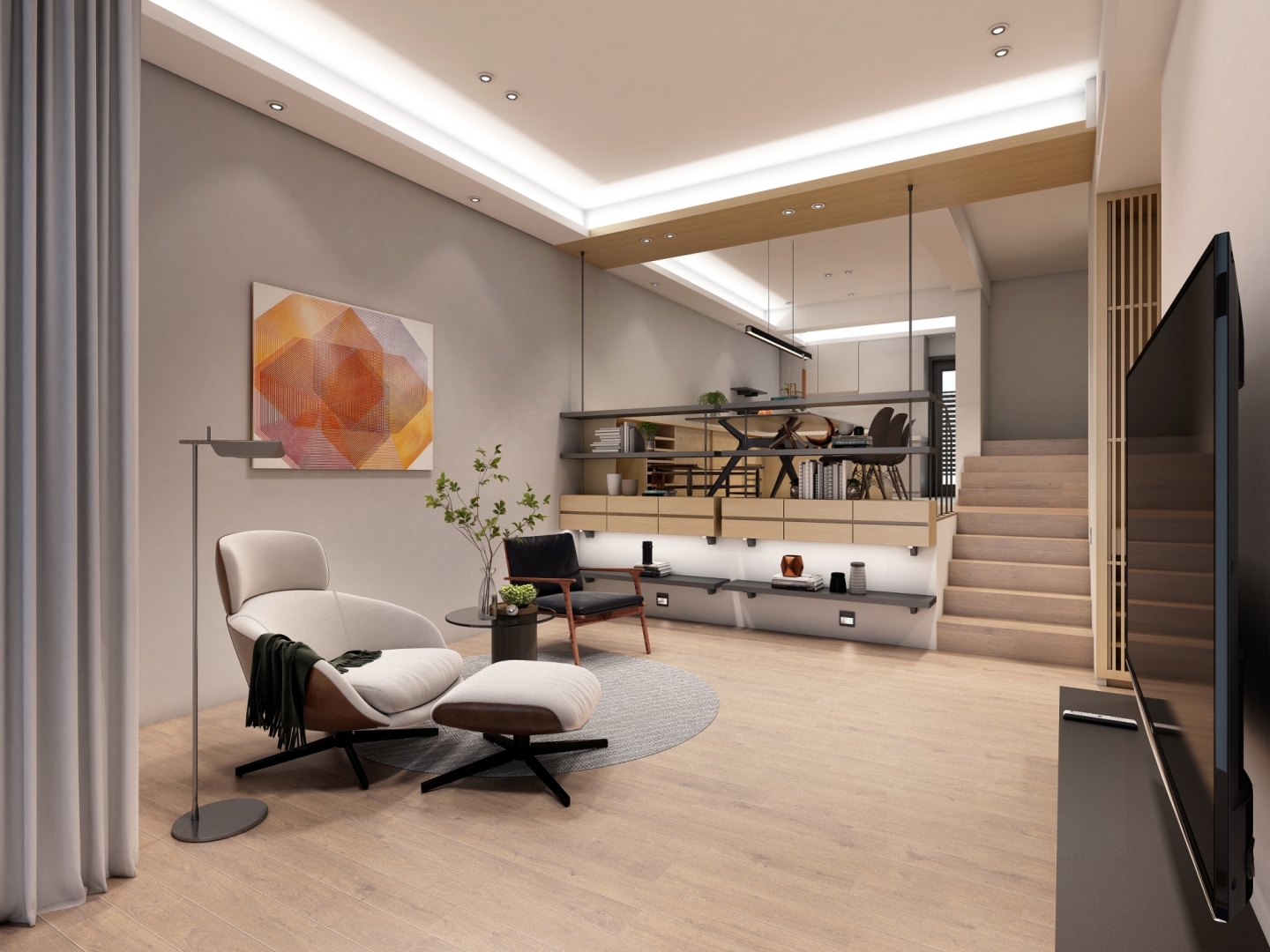 懸浮的木質天花與隱藏式照明相得益彰,為整個空間注入了輕盈感與層次感。