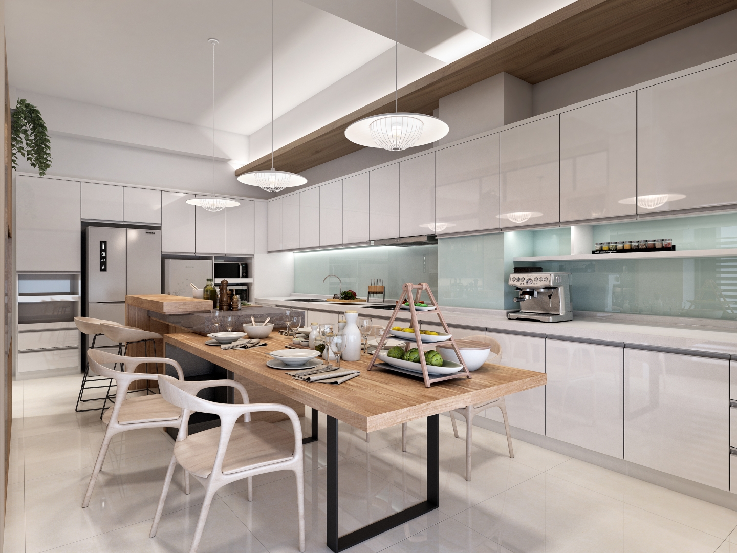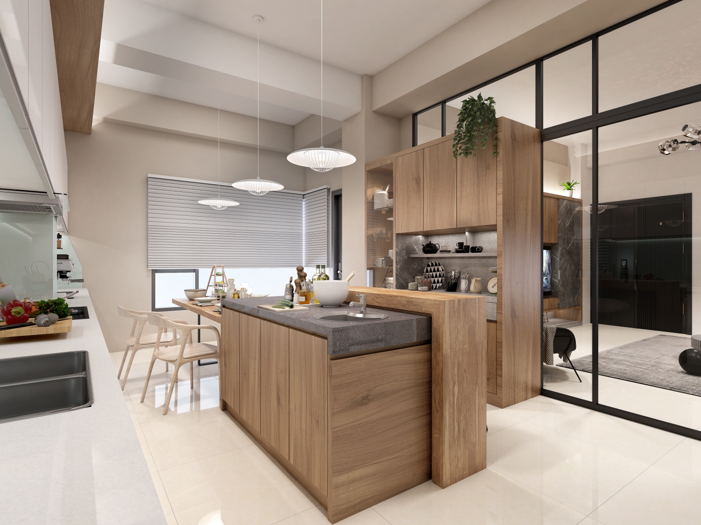 好清潔的白色系櫥櫃搭配溫潤的木質元素,展現沉穩卻又不失現代簡約的優雅。